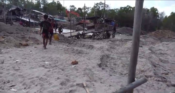 Tak hanya itu, satu alat berat merek Hitachi terlihat menggaruk pasir hingga kedalaman tertentu, mempermudah operasi tambang liar di zona terlarang.
